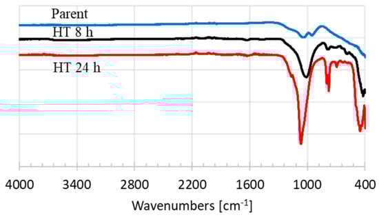 The effects of hydrothermal reaction time on FTIR spectra are presented in Figure 2. The Al−O fragment is indicated by the vibrational bands at 780−820 cm−1. The asymmetric stretch mode of SiO4 and AlO4 are the main vibrational bands, which are shown at wavelengths of about 960−1250 cm−1. A peak pointed at the wavenumber 1081 cm−1 can be associated to Si–O–Si asymmetric stretching vibration, which is indicative of the peak of quartz [18]. The vibration of HOH is shown at the wavelength of about 1560−1690 cm−1. This agrees with the XRD patterns of the HT 24 h showing the quartz crystalline pattern.