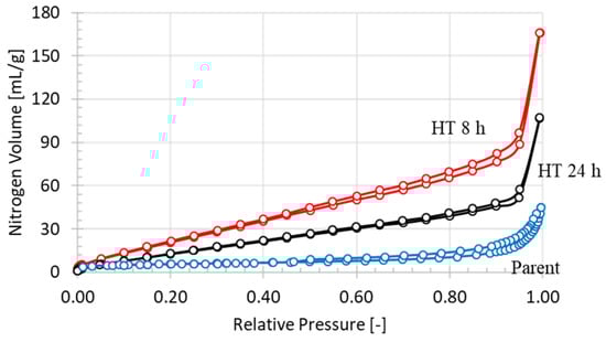 The nitrogen adsorption and desorption isotherms of the parent and the hydrothermally treated natural zeolites are shown in Figure 3. It shows that the hydrothermal treatment time positively affects the nitrogen uptake of natural zeolites. It can be ascribed from the formation of new mordenite crystals for the period of the hydrothermal recrystallization that increased the uptake of nitrogen on the sample HT 8 h. The fast growth of the quartz crystalline phase after hydrothermal treatment for 24 h reduced the nitrogen uptake on the HT 24 h sample.