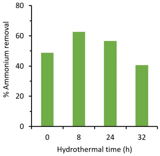 The effect of hydrothermal time of the zeolites on the ammonium removal is presented in Figure 5. It shows that after the 8 h hydrothermal treatment the percentage of ammonium removal increases from an initial 48.9% to 62.6%. However, it starts to decrease after 24 h, with ammonium removal at 56.5%. After 32 h the ammonium removal is lesser than the parent with ammonium removal of only 40.7%. The high percentages of ammonium removal at sample HT 24 h and HT 32 h are most likely because of the quartz phase competing with the mordenite growth. The quartz has no capacity for ammonium sorption, hence the percentage of ammonium becomes lower with longer hydrothermal treatment time. The transformation of the zeolite phases from mordenite and clinoptilolite to phillipsite during the hydrothermal treatment occurs within 1–7 days [16,17]. High concentration of NaOH tends to shorten the phase conversion time. Watanabe et al. [17] reported that natural mordenite was successfully converted into zeolite phillipsite after 7 days under hydrothermal treatment. The ammonium removal increased from 32% to 64%.