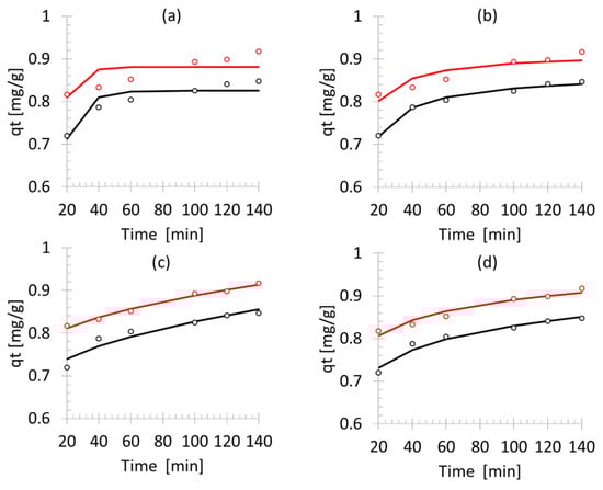 Non-linear least squared (NLSS) fitted kinetic model: (a) first order, (b) second order, (c) intraparticle, (d) Elovich model.