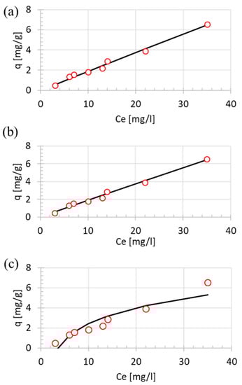 NLLS fitted isotherm models of (a) Langmuir, (b) Freundlich, and (c) Temkin.