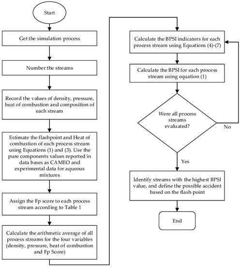 Once the Fp value of all of the process streams has been estimated, their hazard level is assigned using the flash point score given in Table 1, and the average of this parameter is calculated considering all streams. Finally, the combustibility indicator (IFp) is calculated using Equation (4). The other indicators are estimated in a similar way using Equations (5)–(7). With this strategy, the most hazardous process flows can be identified, and potential accidents can be assessed. Figure 1 shows schematically the steps for the calculation of the BPSI index.