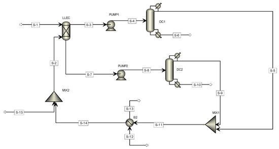 The flowsheet of the separation and purification process of 2-PEA, as implemented in the Aspen Plus process simulator, is shown in Figure 2. The feed (S-1) to the extraction column (LLEC) comes from the fermentation of whey [16]. The extract (S-3), containing mostly ethyl acetate and 2-PEA, is obtained, after which a pump is used to increase its inlet pressure to the distillation column.