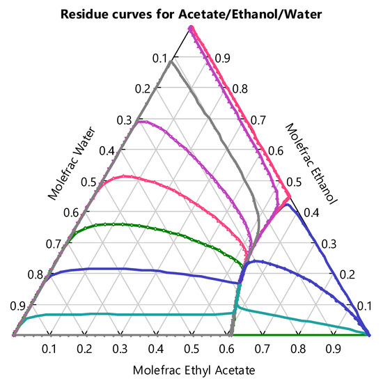 Residue curve map for the ethyl acetate–ethanol–water ternary system.