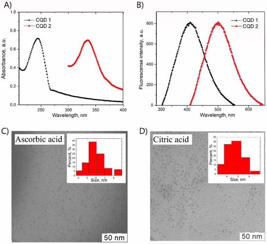 The core of fluorescence CQD 1 and CQD 2 with a varied source for carbonization stage correspond with acid sources and position of absorption (ABS) peak. Briefly, in the equal amount of citric acid or ascorbic acid, the ABS peak of CQD 1 at 250 nm, and the peak of CQD 2 is attributed to the right on 90 nm. The evolution between the Stokes shift of the first and second type of nanoparticles is slightly different. The fluorescence (FL) peak excited at a maximum of ABS wavelength shown in Figure 2B at 410 nm and 500 nm for CQD 1 and CQD 2, respectively. Optical curves have been in equal intensity of excitation and emission.