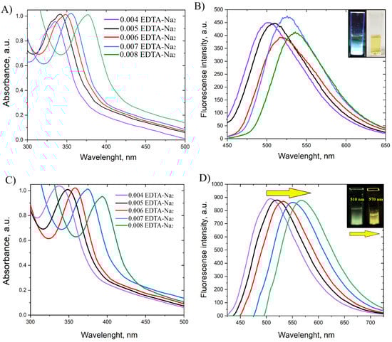 (A) Absorbance spectra of CQD 3 with a different mol EDTA-Na2 (0.004, 0.005, 0.00. In this case, the CQD dispersion (the position of maximum fluorescence at 530 nm) with a final concentration at 0.68 mg/L was designed, 0.007, 0.008), (B) emission spectra of CQD 3, respectively, (C) absorbance spectra of CQD 4 with a different mol EDTA-Na2 (0.004, 0.005, 0.006, 0.007, 0.008), (D) emission spectra of CQD 4.