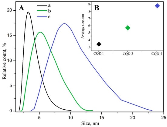 (A) Size distribution of CQD 1, CQD 3, and CQD 4. (B) The average size of CQD 1, CQD 3 and CQD 4.