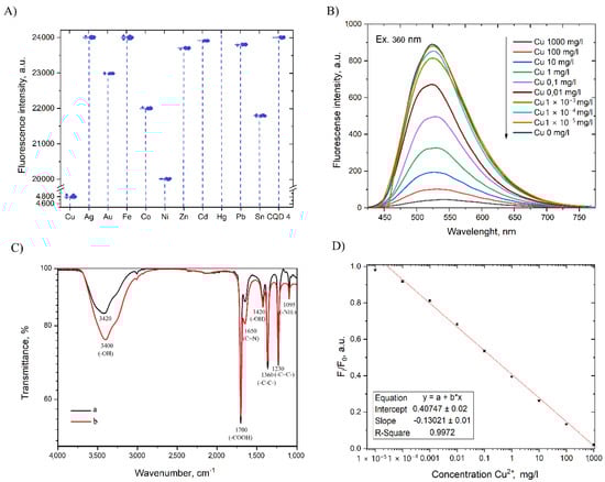 (A) The fluorescence quenching effect of CQD 4 with metal cation in water, (B) Concentration dependence for the fluorescence quenching of PL CQD 4 by Cu2+, (C) FTIR spectra of CQD 4 before (a) and after (b) coordinated Cu2+ cations, and (D) The linear relationship between the fluorescence intensity CQD 4 and the Cu2+ concentration.