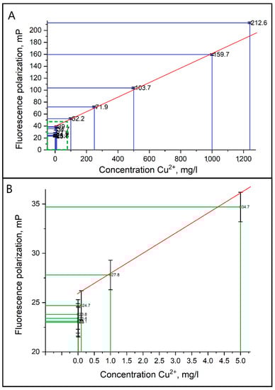 For FPA rapid analysis (Figure 6a) low detection limit of Cu2+ concentration is 1 mg/L, which is comparable to fluorescence intensity (Figure 6b) measurements from outside laboratory location []. The method of measuring the fluorescence polarization allows determining concentrations, which are compared with the fluorescence intensity method, but the errors show a high accuracy level. In addition, functional groups react with copper ions, hence, the average size of carbon nanoparticles was increased. The relative change in polarization values shows a fivefold data increase, opposite to fluorescence intensity is limited to a range of measured concentrations. At the same, the relative measurement error is reduced when using the method of FPA, which is more suitable for the determination of copper.