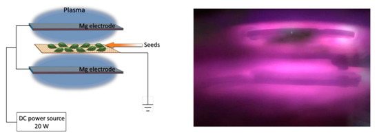 During the plasma treatment, the Mung bean seeds were placed in a vacuum chamber on metal mesh between two Mg electrodes (produced by KJLC, Clairton, PA, USA 99.9% purity). The principle scheme of the plasma treatment as well as the image of the real plasma treatment process is shown in Figure 1. The two electrodes and metal mesh between them was used in order to ensure a homogeneous treatment process for all the seeds surface. The direct current power source (20 W) was used for plasma generation, while air was used as a working gas. The pressure of 10 Pa was kept constant during the plasma treatment process (gas flow was maintained around 30 mL/min). The distance between each Mg electrode and metal mesh was 4 cm. Mung bean seeds were treated in plasma for 10, 30, 60, and 90 min.