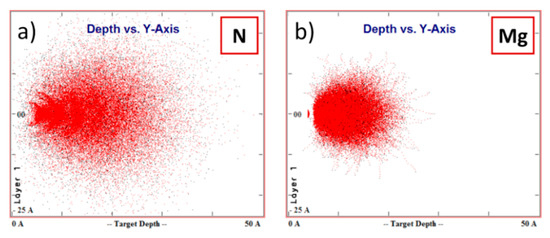 Figure 2 shows the simulation results of the air-plasma and Mg ions penetration in to the Mung bean seeds. The results show that the air-plasma ions penetrated into approximately 3 nm depth of the Mung bean seeds, while the highest concentration of plasma ions penetration was fixed at a 2 nm depth. This means that only a very top layer of the seeds surface is altered during the plasma treatment and such a method does not make any changes on the seeds bulk. However, a majority of the researchers claimed that the plasma ion penetration depth into the various seeds is up to 10 nm [10,32,33]. This disparity between the calculated results and the ion penetration depth provided by other authors could be related to several approaches. First, a majority of the other authors used the term “up to 10 nm” without any ion penetration depth calculations, while it is widely known that the plasma can influence only the “very top layer” of the treated material. Up to our knowledge, there are no articles that indicate a particular penetration depth of cold plasma ions into the seed. Moreover, the existing ion penetration depth models into other materials used different plasma parameters including ion flux, temperature, plasma composition, etc. Therefore, it is hard to evaluate the real difference between our suggested model and the penetration depth results presented by the other authors.