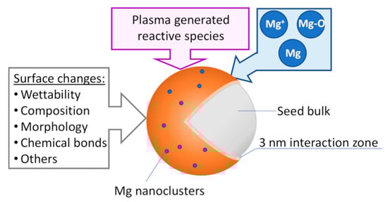 The air plasma consists of a variety of different particles and radicals (electrons, neutral, particles, excited atoms, molecules), as well as UV irradiation. Therefore, it is well known that the gas plasma can result in various effects upon the treated surface including cleaning or alteration of the surface. Many processes can occur during the interaction of air plasma with the seeds surface: The removal of surface contamination, the formation of an altered layer by the implantation of magnesium ions and active ions from air plasma near the surface, the adsorption of magnesium atoms on the surface, the formation of polar molecule groups on the surface which promote surface wettability, the changes in the surface topography on the nanoscale, etc. [8,34]. Under certain conditions, magnesium particles from the used electrodes are sputtered by ions existing in the air plasma. The sputtered magnesium with enough energy is deposited on the seeds surface and oxidized by an active oxygen species in the air plasma (Figure 3).