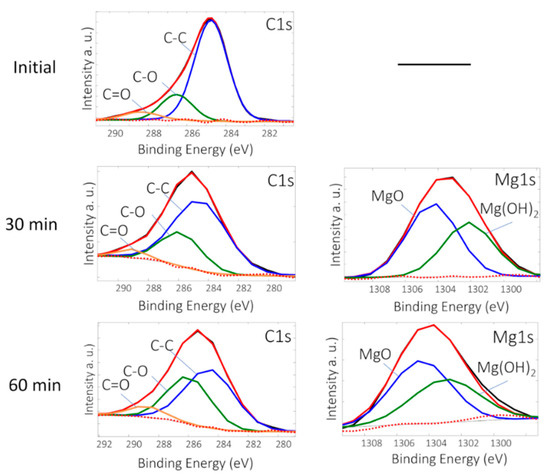 It should be mentioned that the analysis of the O1s peak confirmed the MgO and Mg(OH)2 chemical bond formation with a similar area ratio as in the Mg1s spectra. Moreover, two additional chemical bonds were found (C-O and C=O). These chemical bonds were identified in detail by analyzing the C1s spectra. Nevertheless, any relevant information was found by analyzing the O1s spectra. Therefore, the fitting results of the O1s peak are not presented as a figure.