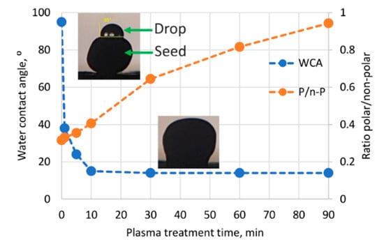 The water contact angle measurement is a simple technique which is used for a qualitative evaluation of surface wettability. The WCA measurement was performed after each plasma treatment time, as well as for the initial Mung bean seeds. The significant reduction of WCA was observed by comparing initial and any other plasma-treated seeds. The WCA value for the initial seed was about 96°. This value decreased until approximately 38° after 1 min and 24° after 5 min. A further analysis revealed that the value of WCA remained relatively stable (about 15°) after 10 min of plasma treatment, while the ratio of polar/non-polar groups increased with a longer treatment time (Figure 6). Such an obvious reduction of WCA determined clear changes of the seeds surface. The surface conversion from hydrophobic to hydrophilic indicated the increment of free surface energy [40]. This, in turn, determined a better water absorption into the seed. G. de Groot et al. used the cold plasma treatment for cotton seed germination improvement [8]. They showed that the cold plasma treatment invoked the seeds surface hydrophilicity and improved water absorption. Moreover, they showed that the enlarged water absorption, compared to the initial seed, was directly related to a better seed germination. The similar germination tendencies were observed by other authors as well, when the plasma treatment encouraged the seeds surface hydrophilicity, which is directly related to a better germination process [10,43,44].