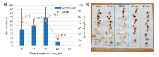 The Mung bean germination experiments were performed with the seeds before and after the plasma treatment process. First, the initial seeds showed approximately 40% germination (Figure 7a). The increment of the germination process was observed after 10 and 30 min of the plasma treatment (50% and 70% germination, respectively). However, a longer treatment time determined a total reduction of the germination process (10% and 0% after 60 and 90 min of the plasma treatment, respectively). The results of the sprouts length average values with the standard deviation (SD) are shown in Figure 7a. The measurements revealed that the longest sprouts were observed after 30 min of the plasma treatment with the average values of 73.9 mm (SD—23.0). Meanwhile, the length of the initial and 10-min plasma-treated Mung bean sprouts were fixed at 71.3 mm (SD—22.8) and 65.2 mm (SD 11.3), respectively.