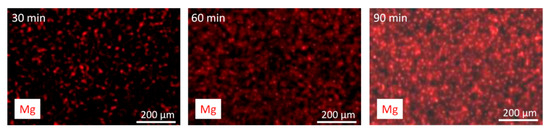 Elemental mapping results of Mg nanoparticles distribution on Mung bean seeds surface after 30, 60 and 90 min of the plasma treatment.