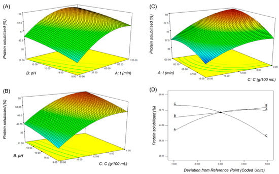 3D contour plots of percentage protein solubilised from A. platensis, (A) extraction time and pH; (B) concentration and pH; (C) extraction time and concentration. (D) Perturbation plot of percentage protein solubilisation—M1. The missing variable is fixed to coded zero level. Actual factors: A (extraction time (min)), B, pH, and C (concentration (g/100 mL)).