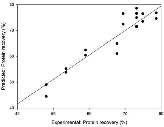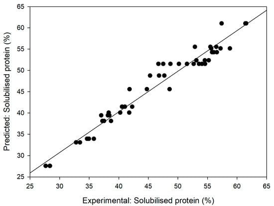 In order to ensure the quality and reliability of the model developed, M1 was validated using the same volumes and procedures followed to generate the model. Data (shown in Figure 2) demonstrated that the predicted percentage of solubilised protein values were accurate enough to fit the experimental results, with a correlation coefficient of 0.9556. Moreover, the combined conditions (extraction time, pH, and biomass concentration) that led to a higher percentage of protein solubilised were determined.