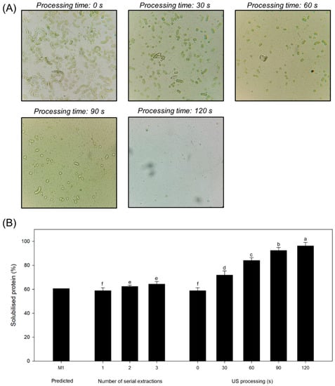 Predicted protein recoveries were approximately 60% for all—the maximum achieved within the studied range without sample pre-treatment. Previous studies suggested that it was necessary to include a disruption step before isolation of bioactive compounds from microalgae. Not all the protein is soluble at the studied conditions because of the rigid cell wall of microalgae, which in the case of A. platensis, consists of four layers and is 40–60 nm thick []. In the current study, shear stress suffered during production and processing, as well as the dehydration step and the osmotic shock suffered while resuspending the dried biomass into distilled water, led to a percentage of total protein that could be solubilised that was lower than 60%. To increase the amount of protein solubilised, the current paper evaluated the potential of (i) performing several sequential extractions and (ii) including a cell wall disruption step using ultrasound.