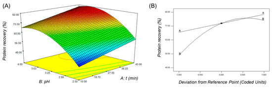 where is extraction time expressed in min and is the pH value at which the precipitation is conducted. As with M1, variables and interactions between variables that were not significant to the model were not considered. Figure 4 represents the 3D contour model graph generated by the software as well as the perturbation plot of percentage protein recovery. In the case of M2, protein recovery was more sensitive to the pH value at which the protein precipitation occurred than to the extraction time, although both variables were significant.