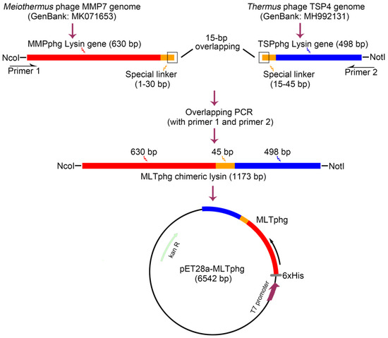 Previously, we have identified two lysins, namely, MMPphg and TSPphg, by sequencing and annotating the genome of Meiothermus bacteriophage MMP7 [13] and Thermus bacteriophage TSP4 [14], respectively. Both lysins have exhibited bactericidal activity against a panel of multidrug-resistant bacterial pathogens, but they are most active between 50 and 65 °C, making the effectiveness and practicability of these two lysins decreased at lower temperatures. In this study, by combining full-length MMPphg and TSPphg lysins of heterologous origins via bioengineering, we have improved the potential of the produced chimeolysin, MLTphg, as a promising antimicrobial agent against a panel of pathogenic bacteria.