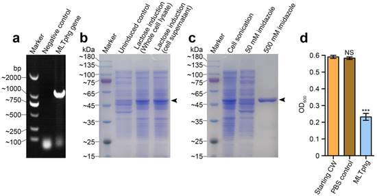 Gene cloning, protein overproduction and purification of MLTphg, and functional validation of cell wall hydrolytic activity of MLTphg. (a) PCR amplification of MLTphg gene. (b) Lactose (1 g/L) was used for induction to overproduce MLTphg. (c) SDS-PAGE analysis of purification of the recombinant MLTphg, which is at approximately 46 kDa as the black arrowhead indicates. (d) MLTphg can digest cell wall (CW) extracted from Staphylococcus aureus ATCC6538. Error bars denote the standard deviation. p Values were calculated using the Student’s t test. ***, p < 0.001; NS, not significant.