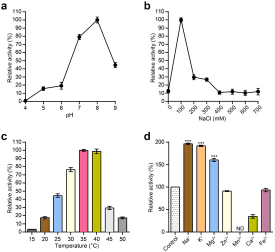 2.5. Assessing Effects of Temperature, pH, NaCl and Metal Ions on the Activity of MLTphg