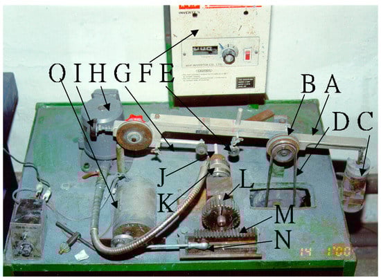Figure 1 shows a photo of the single wire-sawing system that is used for this experimental study [21]. During the experiment, the inverter (F) and the position of the belt (D) for the pulley (B) were adjusted to control the wire speed. The adjustment screw (I) was adjusted to achieve the proper wire (G) tension. The working load was varied by adjusting the balance weight (C) on the arm (A). A pump (H) was used to stir and supply the slurry. The motor (O) drives the rack (M) through a universal joint (N), which moves back and forth. However, the rack drives the gear (L), which rotates in the same way (gear (L)) and which shares the same central shaft as the jig (K). The workpiece (J) also swings back and forth. Table 1 shows all element names and symbols of the single wire-sawing system in this study. There are five machining variables (wire tension, slurry concentration, mixed grains mesh size, wire speed, and working load) in which each is assigned two or three levels. If the experiments were conducted individually, a total of 2 × 34 experimental samples would be required, so an L18 mixed orthogonal table is used to analyze the significant machining variables [16]. This approach is efficient and reduces cost. Table 2 lists the level settings for all experimental variables, which is done using preliminary experimental testing. The slurry concentration is shown as a percentage of slurry grain weight (weight of grain/weight of slurry as a whole). A tool microscope (Tokyo, Japan, Nikon, MM-40) acts as an optical ruler to accurately measure the KW and WW to an accuracy of 1 μm. An SR (Sinapore, Singapore, HOMMELWEREKE, T4000 TURBO) uses a thin-probe to determine the machined SR of SC, using a sampling length of 2.5 mm. A probe (Gloucestershire, UK, RENISHAW PH20) in a coordinate measuring machine (Querétaro, Mexico, COORD3, ARES-7.7.5) was used to measure the flatness of the machined SC. A tension meter (Toyohashi, Japan, IMADA, DPRSX-10TR) was used to measure the wire tension and working load.