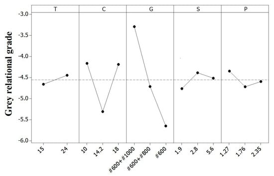 Grey relational analysis (GRA) converts two or more quality characteristics into one quality characteristic and converts multiple responses into a single response. Table 6 shows the grey relational grade (GRG) and its ranking for each experiment that involves the wire-saw machining of SC. The higher the GRG, the closer is the corresponding experimental result to the ideal normalized value and the better is the quality characteristic. Since (T2C1G1S3P3) gives the highest GRG, for experiment 10, it produces the best multiple quality characteristics of all of the experiments.