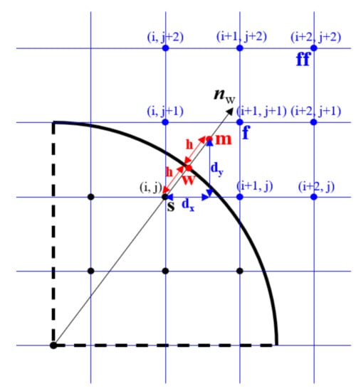 where ϕm is the phase field value of the interpolated point in the fluid (blue dots), and is the distance from the interpolated point to the solid boundary. ϕw is estimated by interpolation: