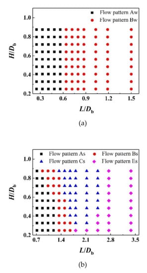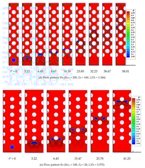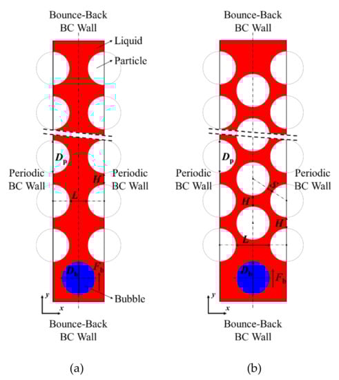 As depicted in Figure 4, two types of symmetric channels are formed by arranging the solid particles in rectangular and triangular matrices, and they are named wavy vertical channel and S-shaped curved channel, respectively. Db and Dp marked in the figures are the bubble and particle diameters, the horizontal spacing L of the particles refers to the shortest distance between two horizontally adjacent particles and similarly the vertical spacing H is the shortest distance between two vertically adjacent particles, and S represents the shortest distance between two diagonally adjacent particles. Hereinafter we use the particle spacing normalized by the bubble diameter to characterize the channel width.