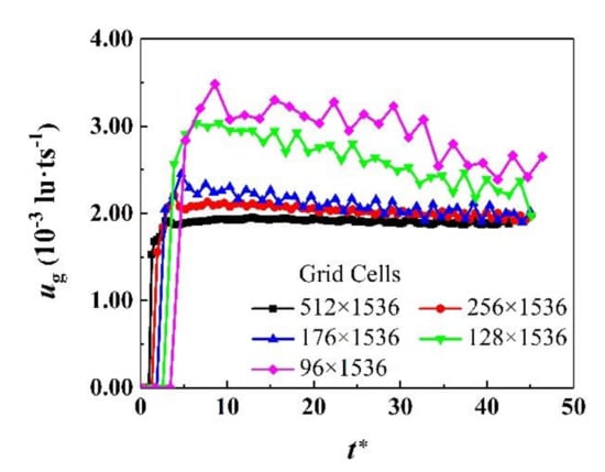 The channel structure and the effect of the channel on the bubble are greatly affected by the grid, so the case of the bubble rising in a rectangular channel without particles at ReGr = 100 and Eo = 20 is selected for testing the grid independence. Five different grids with Nx × Ny = 96 × 1536, 128 × 1536, 176 × 1536, 256 × 1536 and 512 × 1536 grid cells are applied in the bubble rising problem, respectively. The number of grid cells in the y-direction is sufficiently large and constant because its influence on the bubble steady velocity is negligible. The rising velocity variation of the bubble with Db = Nx/5 over the dimensionless time is present in Figure 5, and the gravity-based dimensionless time is defined as . It can be observed that when the grid cells are less than 176 × 1536, the bubble terminal velocity is unstable, and the calculation deviation is unacceptable. Thus, the minimum number of grid cells used in the following simulations is set to 176 × 1536.