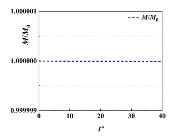 In order to verify the mass conservation of the current model, the evolution of the total system mass versus the dimensionless time is recorded in Figure 6 during a numerical simulation of bubble rising in a wavy vertical channel with L/Db = 0.719 and H/Db = 0.875 at ReGr = 100 and Eo = 20. It is observed that the variation of the normalized total system mass M/M0 is much less than 10−6 over a long period of time, indicating that the mass of the gas-liquid two-phase system is conserved well using current phase-field LB model.