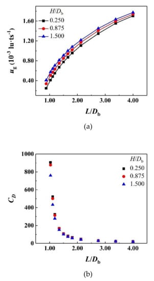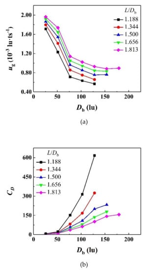 ug and CD under different channel widths are given in Figure 8, which are calculated by averaging the regularly fluctuating ug and CD over a certain period of time in Figure 7. CD is found to be lower as the channel width becomes wider, and the bubble rises faster. The same results are observed by Patel et al. [38] in the studies on the effects of the amplitude of the sinusoidal channel walls on bubble dynamics. In addition, the horizontal spacing between particles has a more severe impact on the bubble movement than the vertical spacing of the particles. Because the horizontal spacing of the particles directly affects the interaction between the bubble and the particles, and determines the difficulty for the bubble to pass through each gap, while the vertical spacing affects the fluctuation frequency of the bubble drag force, which can only indirectly act on the drag force. In view of this, unless otherwise stated, the following numerical results are obtained from the simulations in the channels with H/Db = 0.875.