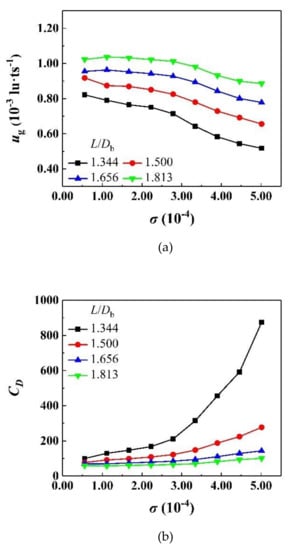 Furthermore, the declining ug and ascending CD are observed in Figure 10 when the surface tension is gradually increasing. This is because the bubble resists deformation more strongly when colliding with the particles, which restricts the bubble rising velocity. In contrast, the bubble with smaller surface tension is more likely to pass through the narrow gaps in the channel by deforming or even breaking. This phenomenon is consistent with the numerical results of Patel et al. [38], and similar to the studies on the effect of surface tension on liquid penetration by Shi et al. [39].