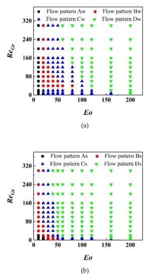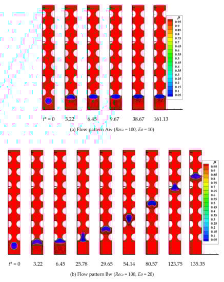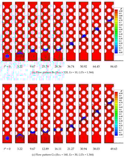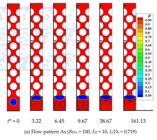 Table 1 lists the terminal bubble shapes under different ReGr and Eo obtained by present LBM and other experimental or numerical methods [33,34,35,36,37]. By comparison, the terminal bubble shapes in our simulations can be observed to be highly similar to other research results, which achieves numerical stability under large liquid-to-gas density ratio conditions and demonstrates the qualitative accuracy of the current LB model.