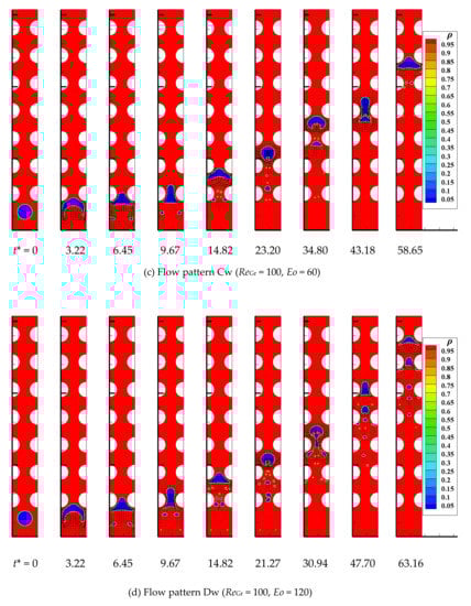 Figure 7 shows the evolution curves of bubbles rising velocity and drag coefficient versus the dimensionless time at ReGr = 100 and Eo = 20. In the wavy vertical channel, the bubble is prone to a stabilized state with a periodically fluctuating terminal velocity, along with CD fluctuating within the certain ranges. In Figure 7, compared with the channel without particles, the rising velocity of the bubble is lower, and the drag coefficient is larger in the channel when the particles are arranged, which indicates that the presence of particles has a significant hindrance to the movement of the bubble.