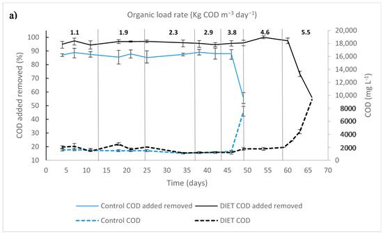 On the seventh day, the maximum propionic acid concentration was reached with values recorded at 2.66 ± 0.56 g L−1 in the control process (Figure 5). At the end of the experiment, the concentration of propionic acid registered in the control process was greater than 2 g L−1. The degradation of propionic acid in anaerobic reactors is a thermodynamically unfavorable oxidation process, which causes its accumulation and inhibition problems in the reactors [37]. The control process achieved a COD removal of 62.66 ± 6.23% (Figure 6a).