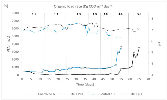 On day 54 of experimentation, with an organic loading rate of 4.6 kg COD m−3 day−1, the VFA concentration reached levels of 2.6 g L−1 in UASB control; while in UASB DIET the values were 1.4 g L−1. The VFA/alkalinity ratio exceeded 0.5 in UASB control. A UASB reactor has optimal performance when the VFA is kept below 1.5 g L−1 and the VFA/alkalinity ratio is below 0.5 [24,25].