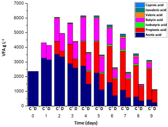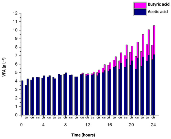 At the end of the experimentation, the VFA concentrations were 8.1 and 10.5 g L−1 for CR, and MR respectively. Likewise, Figure 3 shows that acetic acid makes up 100% of the VFAs during the first 10 h. Butyric acid was generated after 11 h of experimentation.