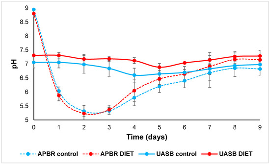 pH in APBR control, APBR DIET, UASB control and UASB DIET.