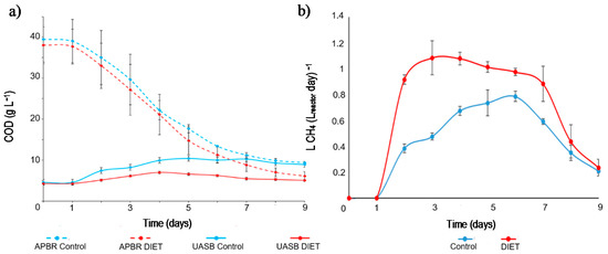 Figure 6b shows the methane yield throughout the experiment. The UASBs started to feed the APBRs at the end of the first day, so a record of generated methane was at the end of the second day of the test. From the beginning to the end of the test, the methane yield was higher in the DIET process than in control process. The methane yield in the DIET process was over 0.9 LCH4 (Lreactor day)−1 until the sixth day of experimentation. This value was never reached by the control process. At the beginning of the experiment, there was a higher concentration of organic matter, which was used by UASB DIET to reach 1.08 ± 0.13 LCH4 (Lreactor day)−1. In the control process, the highest methane value was detected on the sixth day of the test (0.79 ± 0.04 LCH4 (Lreactor day−1). The control process required a longer time than the DIET process to degrade the VFA. Consequently, there was a lag of three days to achieve the maximum methane yield in the control process. The total methane yield throughout the experiment was 55% higher in the DIET process. Increases between 20% and 300% have been reported in methanogenic reactors when conductive materials have been added [19,40,48].