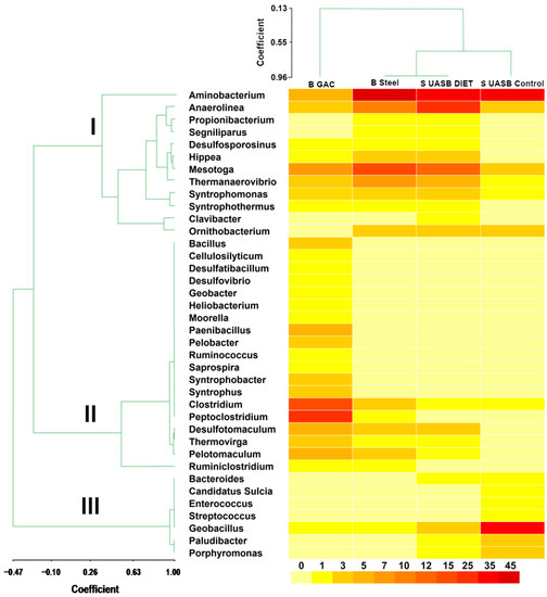 To explore the improved methanogenesis in the reactor supplemented with GAC, the bacteria communities were analyzed by sequencing the 16S rRNA gene of the biofilm adhered to the GAC to the steel mesh and suspended sludge in the two reactors described. The dendrogram located at the top of Figure 7 explains the similarity between the four samples analyzed. S UASB control shows a similarity coefficient of 0.64 with S UASB DIET and B Steel. However, the correlation coefficient between S UASB DIET and B steel was 0.96, indicating great similarity between both samples. B GAC shows the greatest difference with respect to the other three samples with a coefficient of 0.13. The GAC was static inside the steel bag and the carbon surface is porous, allowing the development of completely different communities in B GAC sample.