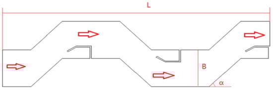The schematic diagrams of the studied air–water separator with corrugated plates are shown in Figure 1 and Figure 2. The air–water separator mainly includes corrugated plates, cyclone and net cushion. The width and height of the main working body of the air–water separator are W and H, respectively. The structural parameters of the single channel of the air–water separator mainly include total width of the air–water separator W, total height of the air–water separator H, length of each corrugated plate L, spacing between two corrugated plates B and turning angle of corrugated plates α.
