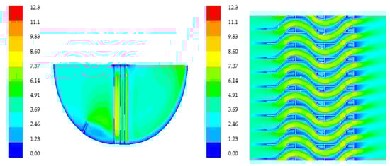 In order to illustrate the distribution characteristics of the flow field, two sections of the flow field are selected to analyze, and the relative position of the sections are shown in Figure 1. In the analysis of the cross section, on the two sides of the wave channel the structure is simple and the change of the flow field is not very obvious, so the local part of the corrugated plate channel is directly analyzed. The typical velocity distributions of the air phase in the separator are shown in Figure 3. From Figure 3a, it can be seen that the presence of baffle at the 90 degree bend makes the velocity behind the baffle increase in the bend area. Figure 3b shows that the existence of a hydrophobic hook and the curvature of the flow passage cause the unevenness of the velocity distribution, and a low speed zone are correspondingly generated inside and behind each of the hook grooves. The maximum velocity in the flow field exists in the top area of the hydrophobic hook, and the low speed zone is at the bend of the corrugated plate. There is a distinct vortex at the back of the hydrophobic hook, which is a low speed recirculation zone.