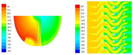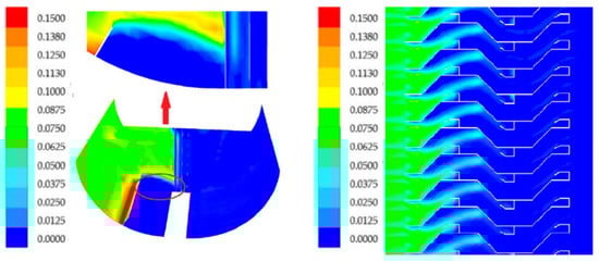 In Figure 4, one can see that the total pressure decreases gradually along the flow direction, and the low pressure area behind the hydrophobic hook at the end of the third stage is relatively large, which shows that the hydrophobic hook has a great influence on the flow field distribution of the corrugated plate channel. The total pressure behind the hydrophobic hook drops sharply near the recirculation zone, and the loss increases significantly. Due to the effect of mixing, the total pressure increases after the recirculation zone.