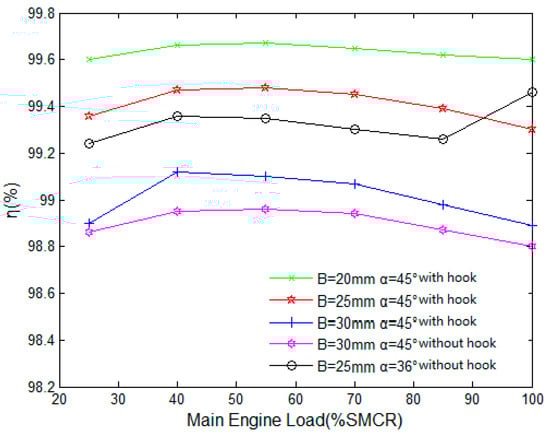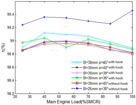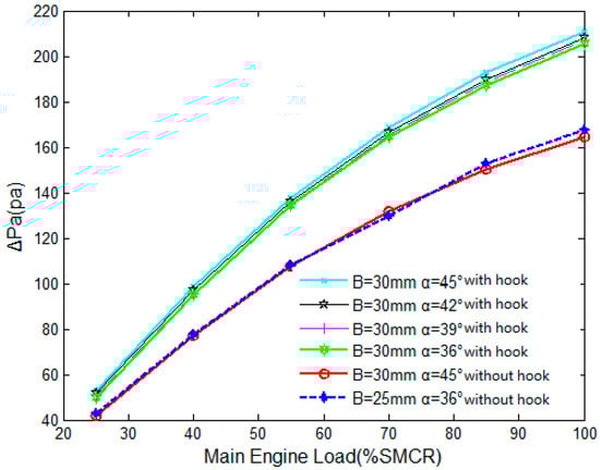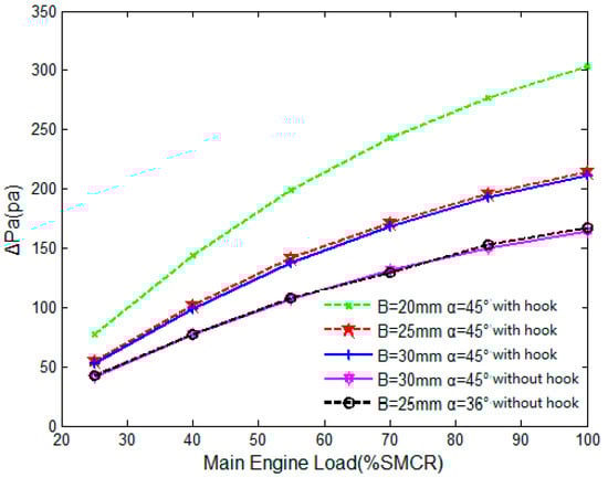 Several structural parameters affect the pressure loss and separation efficiency of the air–water separator, including the shape of the corrugated plate, the spacing, the size of the turning angle, the existence of the hydrophobic hook and the position of the structure. Under different loads of the main diesel engine, the performance of the air–water separator is numerically calculated under the conditions of different corrugated plate spacing, different turning angle of the outlet and the separator with or without the third stage hydrophobic hook.