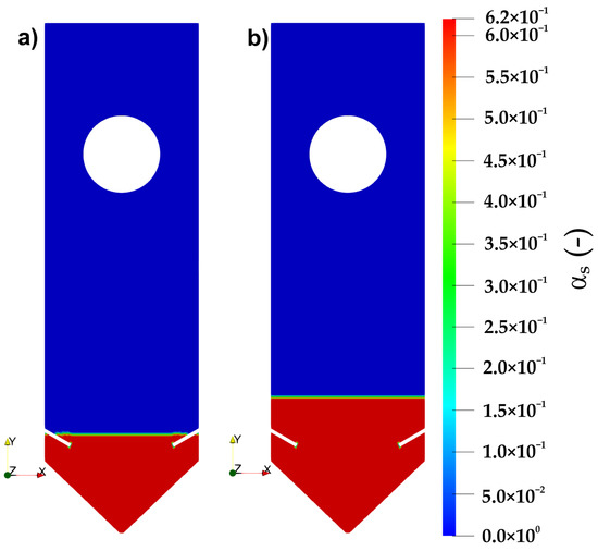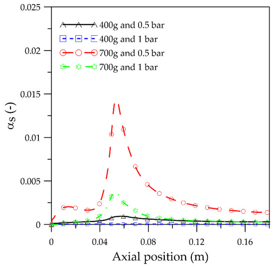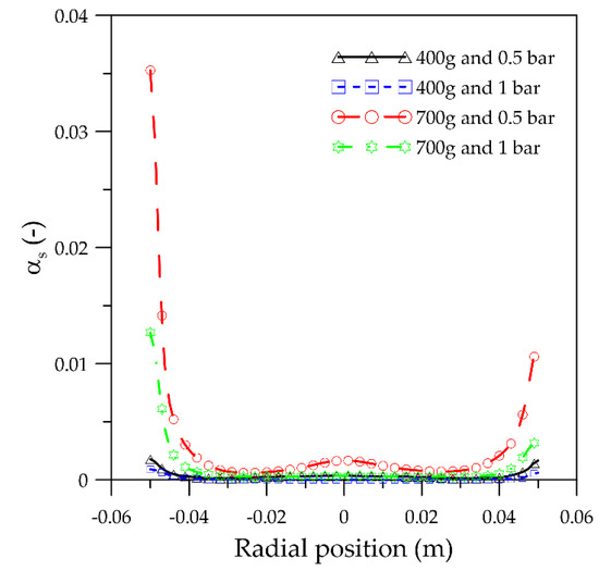 3.2. Influence of the Solid Holdup and the Nozzle Inlet Pressure on the Time-Averaged Particle Volume Fraction Distribution