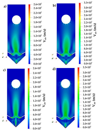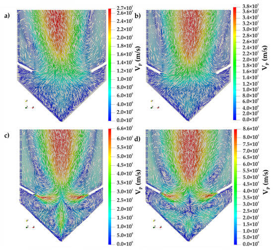3.3. Analysis of the Particle–Fluid Dynamics Inside the Fluidized Bed Opposed Jet Mill