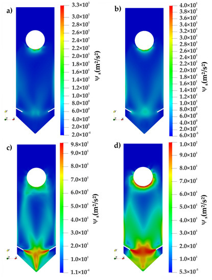 - Apart from the particle–particle interactions in the grinding region, significant particle–particle interactions at the walls of the grinding chamber, the cylindrical lateral’s wall, and the classifier’s wall were observed, indicating that not only the air jets but also the equipment walls are contributing to particle breakage and comminution efficiency.